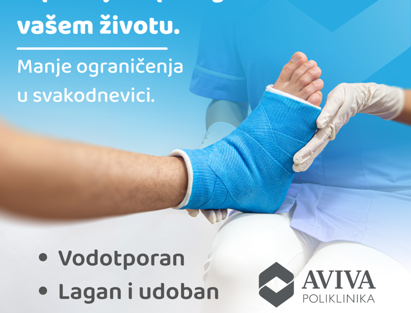 Od sada u Poliklinici Aviva nudimo novu uslugu - plastični gips. Za razliku od klasičnog sadrenog gipsa, plastična imobilizacija je lakša i tanja, čvršća i otpornija, vodootporna (moguće tuširanje), prozračna i ugodnija za nošenje i dostupna i u bojama (plava ili crvena).